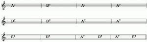 Az első négy taktus a hagyományos bluesban általában I. fok. Ennek a monotóniáját töri meg a második taktusban bejátszott IV. fok. A harmadik taktusban visszaáll a rend, vagy A7-es akkord következik.