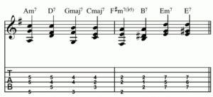 A két alapformából már össze tudod úgy rakni a kíséretet, hogy az akkordok egymás mellé kerülhetnek. Amikor így, egymáshoz közel helyezkednek el a harmóniák, akkor beszélhetünk akkordfűzésről. Ez persze nem azt jelenti, hogy nem ugorhatsz nagyokat a kíséret során.